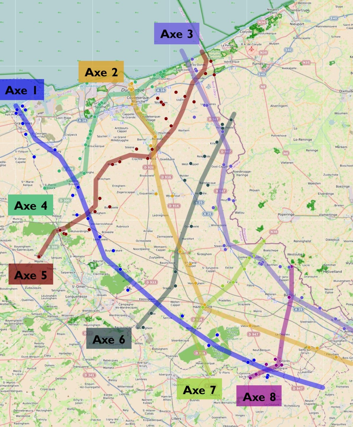 Le fonds photographique est construit en 8 axes. Il s’agit de lignes directrices qui maillent le territoire et suggèrent l’appartenance commune de ces lieux à un territoire de projet : l’Axe Flandre.